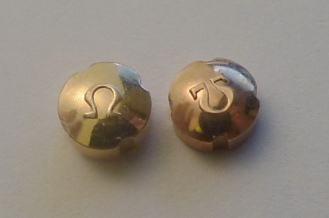Two extremely hard to find gold capped 4 notched Omega Seamaster crowns. One in Yellow gold and one in Rose gold. Found these two out of a purchase of over 400 crowns in the last 10 years. New crowns sold on Ebay as NOS are basically new replacement crowns in gold plate and rose gold has not been produced in the past 20 – 30 years.
