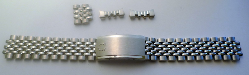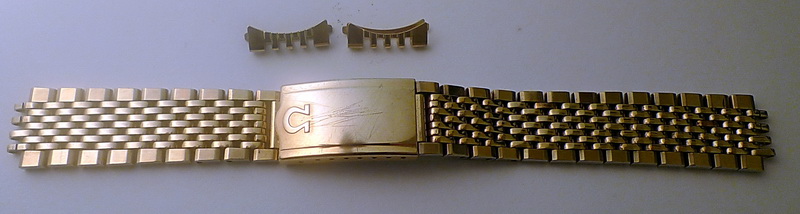 Vintage Omega Beads of Rice Bracelets 20 micron gold plated 7 link bracelet. Scratches on the buckle. Rest is clean and good tight links. One original end piece. Other is a modern replacement and not really a match. If you have a bad bracelet with stretched links, but good buckle and end pieces. You'll end up with great bracelet for your watch